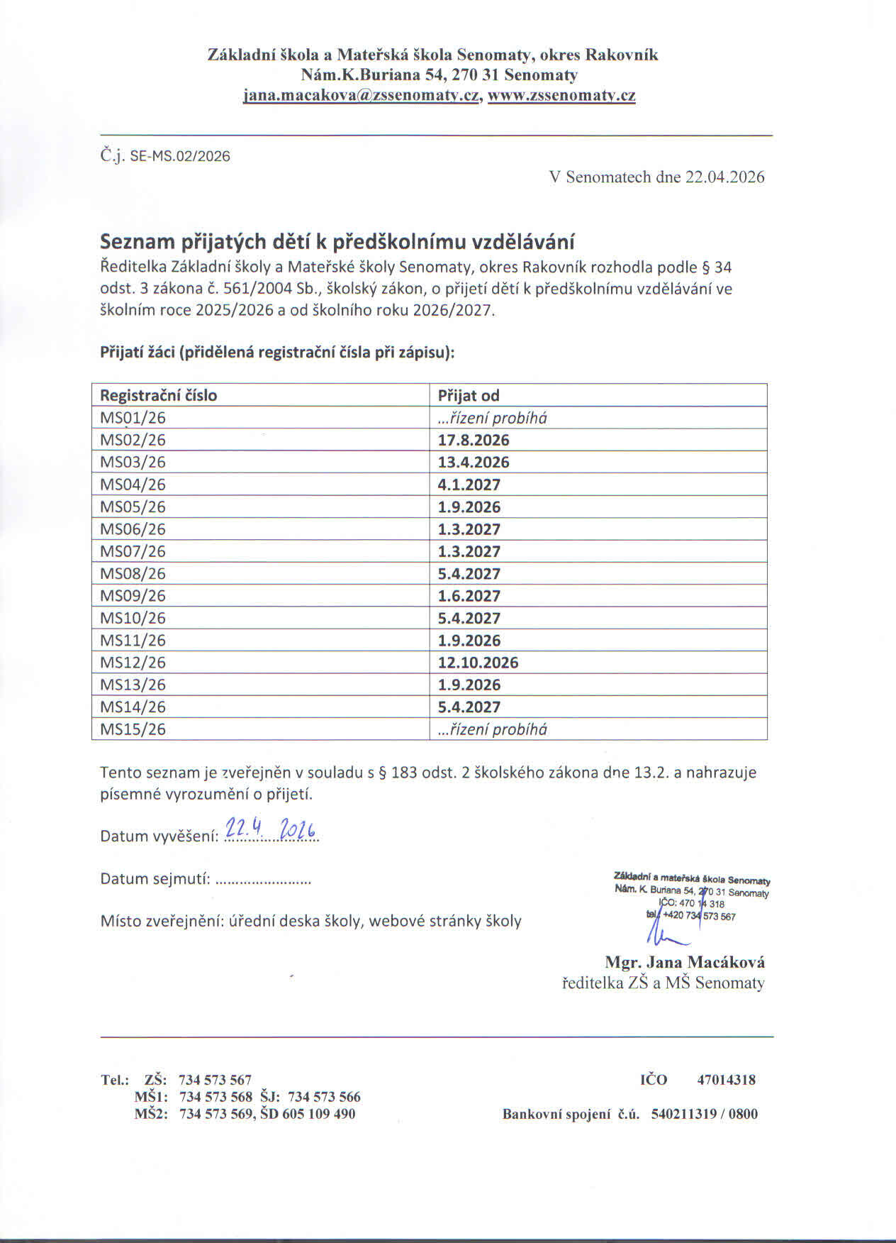 Ředitelka Základní školy a Mateřské školy Senomaty, okres Rakovník rozhodla podle § 34 odst. 3 zákona č. 561/2004 Sb., školský zákon, o přijetí dětí k předškolnímu vzdělávání ve školním roce 2025/2026 a od školního roku 2026/2027.